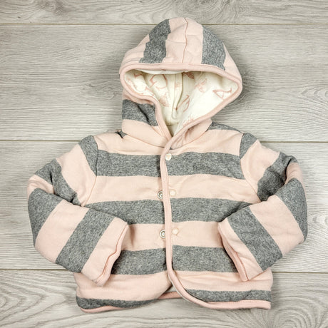 KAMG3 - Burt's Bees grey and pink striped quilted hoodie. Size 3-6 months