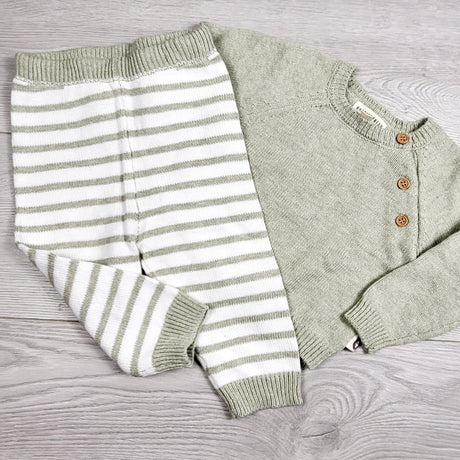 EHEM1 - Rabbit + Bear sage green and white 2pc sweater set. Size 6-9 months