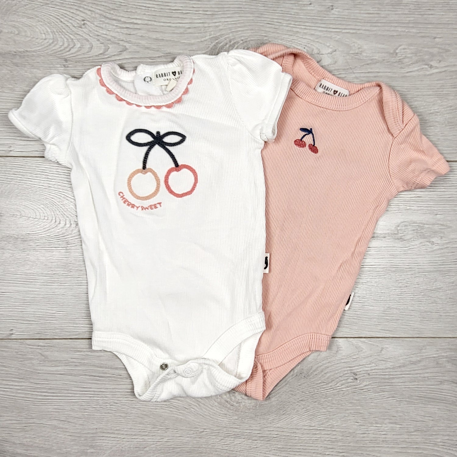 Rabbit + Bear ribbed bodysuits with cherries (2pcs). Size 3-6 months