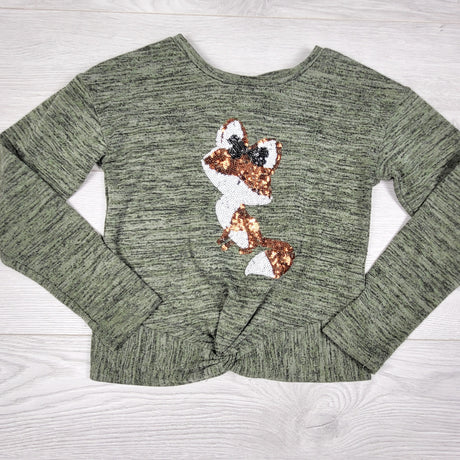 SKOT2 - Mid heathered green knit top with sequin fox. Size 5/6