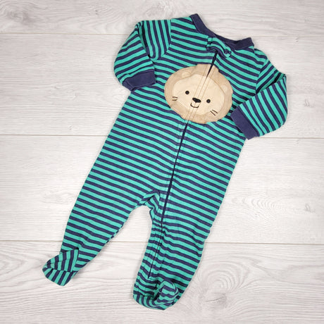 PTOM1 - Child of Mine green and navy striped zippered cotton sleeper with lion. Size 3-6 months