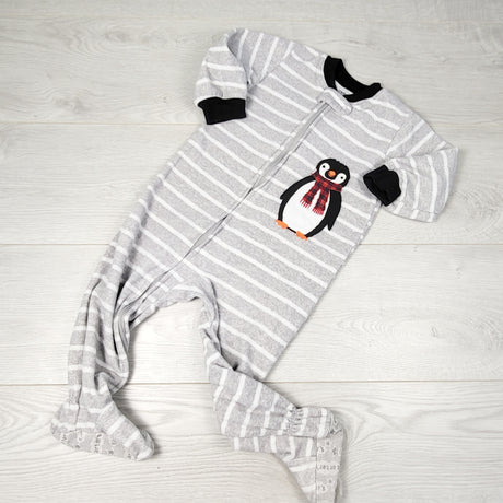PTOM1 - Carters grey striped zippered fleece sleeper with penguins. Size 18 months