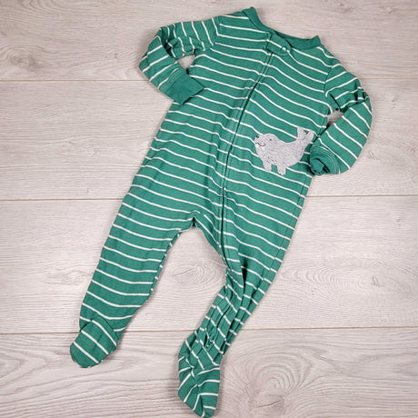 DOKN1 - Carters green striped zippered cotton sleeper with walrus. Size 9 months