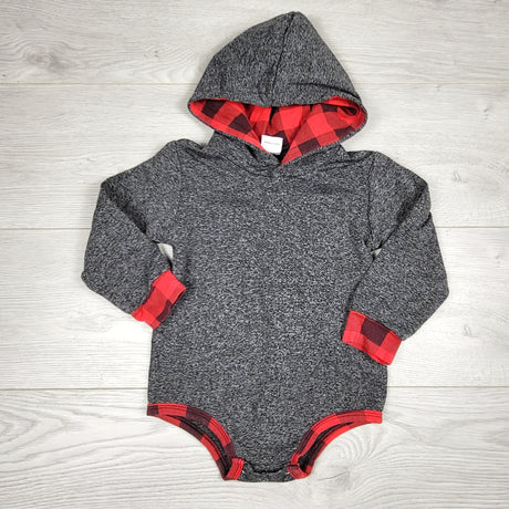 KSAL1 - Grey marled hooded bodysuit with buffalo plaid trim. Size 12-18 months