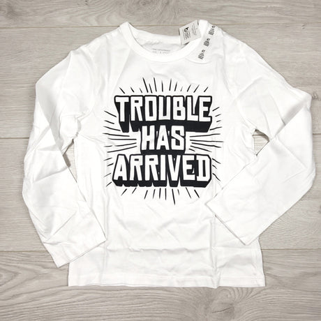 TCWD1 - NEW - Children's Place white "Trouble Has Arrived" shirt. Size 4T