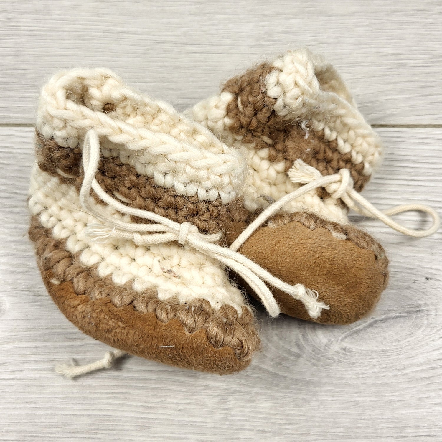 Handmade cream and brown booties. Size like 0-6 months