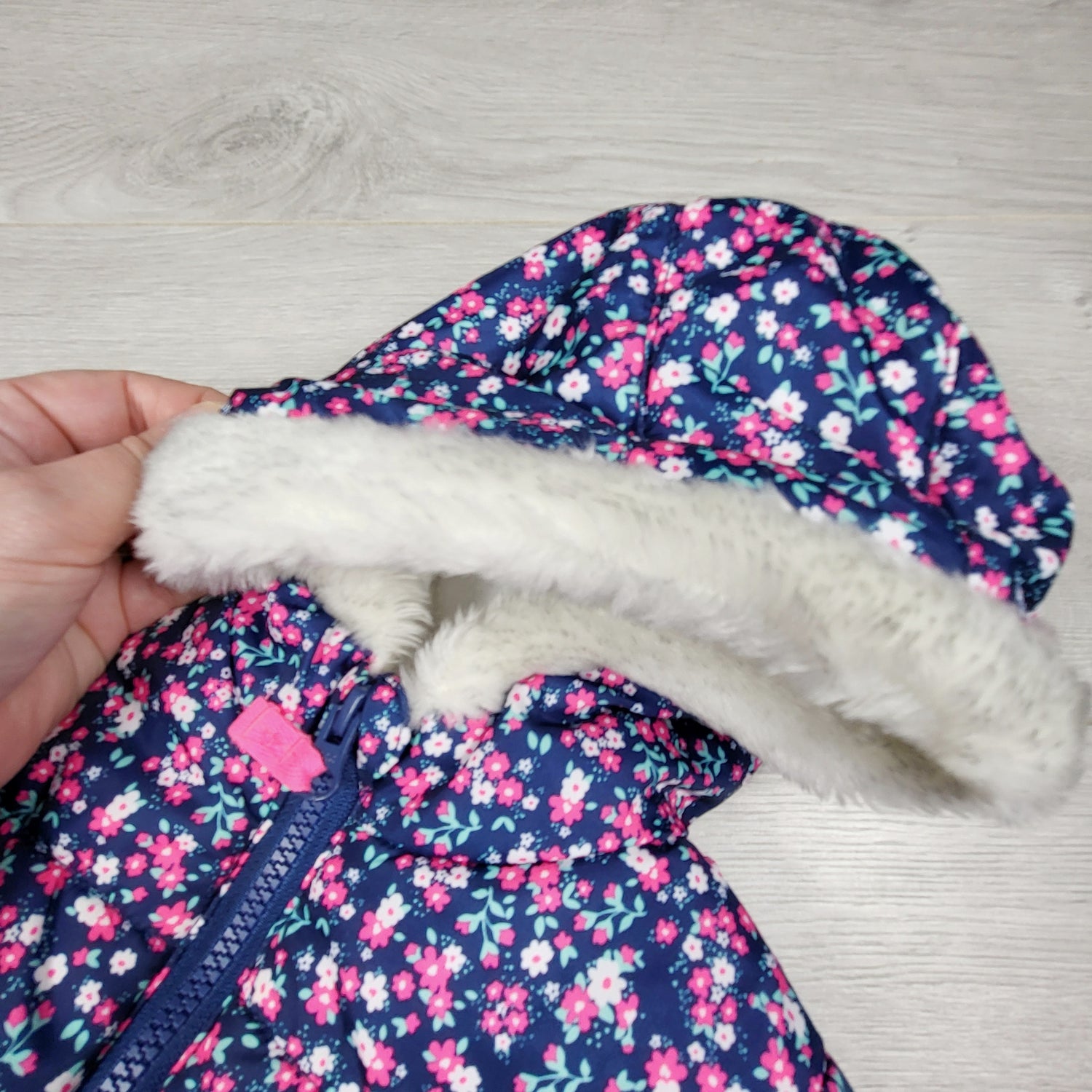 Good condition but fur trim has some discoloration