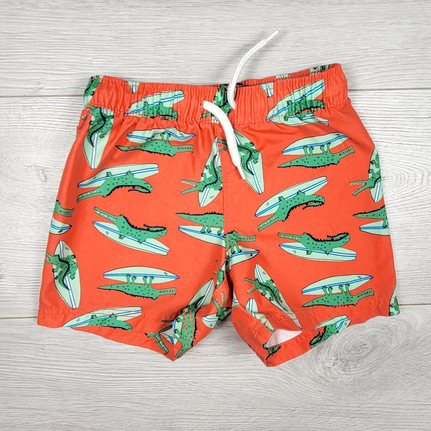 Old Navy reddish-orange alligator swim shorts. Size 12-18 months