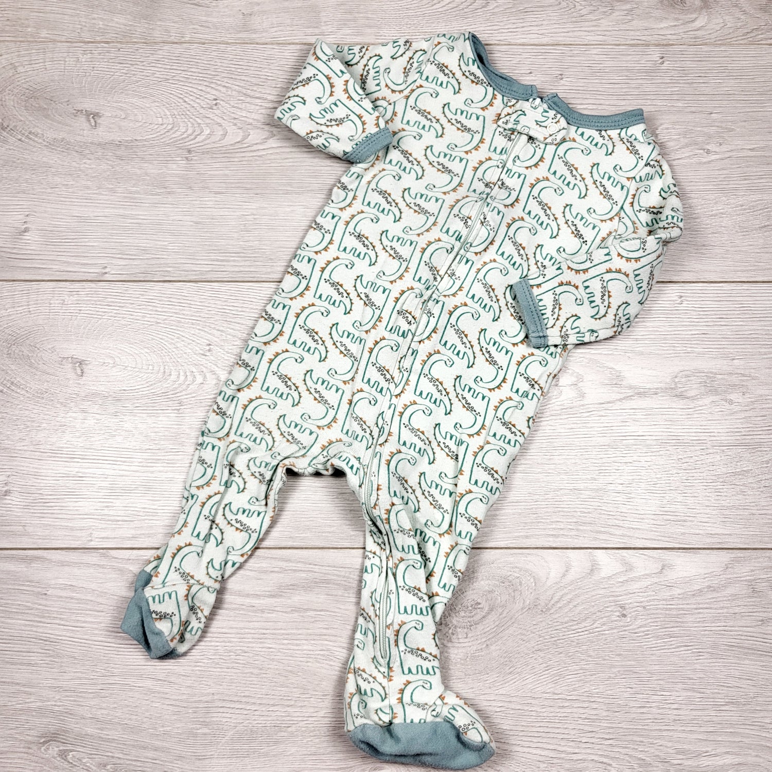 The Peanutshell pale green zippered cotton sleeper with dinosaurs. Size 6 months