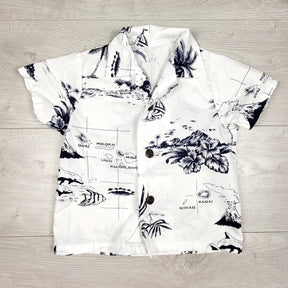 White and navy Hawaiian print button down shirt. Sizes like 2T