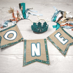 Wilderness themed "One" highchair banner and felt crown